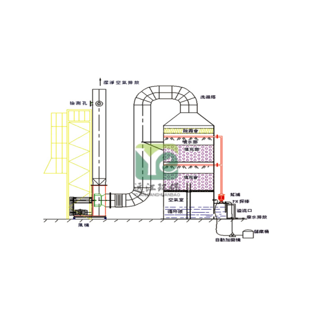 YJ-B-酸霧淨化塔是本公司根據國外廢氣處理設備結合我公司酸霧處理塔改進的新一代廢氣處理設備(bèi)。該設備具有阻力小、能耗省、噪聲低(dī)、處理效率高(gāo)。能處(chù)理氯化氫、氟化氫、氨(ān)氣(qì)、硫酸霧、磷(lín)酸殘(cán)留、硫化(huà)氫等有機酸霧(wù)氣體。低於(yú)國家排放標準。它具有效力高,耐腐蝕性強,高強度.低(dī)噪聲、耗電少、體積小、拆裝維修方便(biàn)、輕巧耐用,外形美觀大(dà)方等優點。
